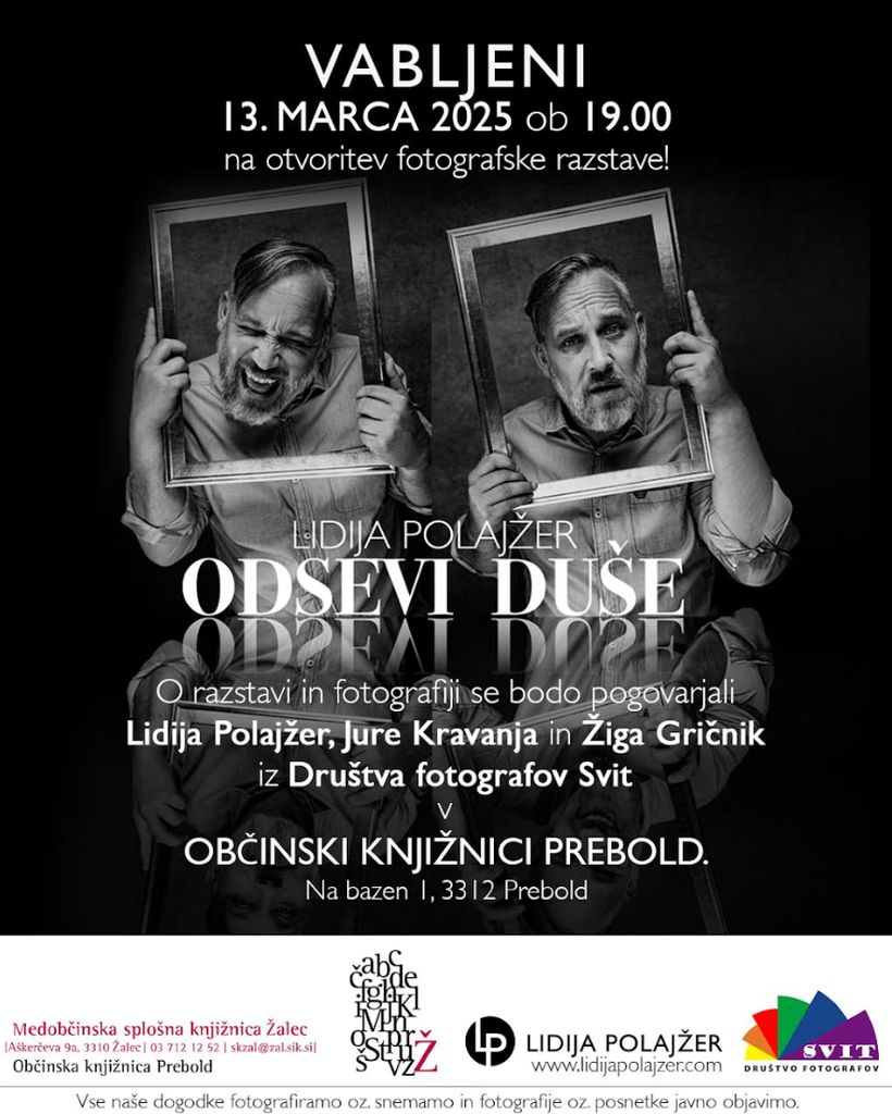 v Občinski knjižnici Prebold v četrtek, 13. marca 2025, ob 19. uri prirejamo večer v sodelovanju z Društvom fotografov Svit. Vljudno vabljeni na odprtje razstave Odsevi duše domačinke Lidije Polajžer, v pogovoru o fotografiji se nam bosta pridružila tudi Žiga Gričnik in Jure Kravanja. Z veseljem vas pričakujemo.
