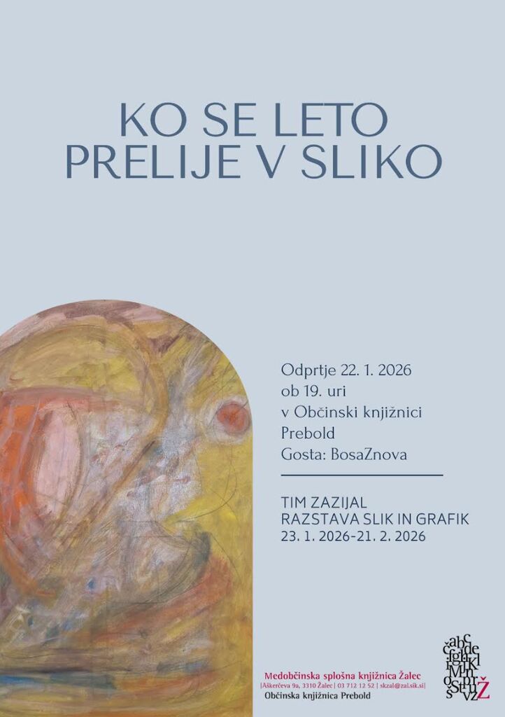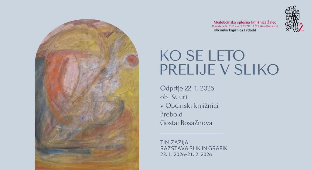 v četrtek, 22. januarja 2026, vas vabimo v Občinsko knjižnico Prebold na pogovorno-glasbeni večer z odprtjem razstave slik in grafik, ki jih je na ogled postavil avtor Tim Zazijal. V glasbenem programu dogodka bo z nami duet BosaZnova.
