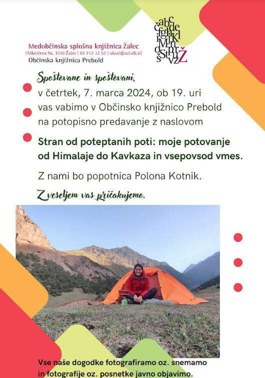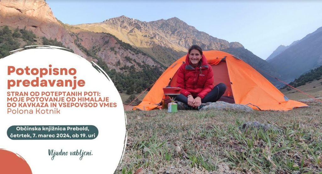 V Občinski knjižnici Prebold nas bo popotnica Polona Kotnik v sliki in besedi popeljala od Himalaje do Kavkaza in vsepovsod vmes. Vabljeni s knjižnico po svetu, v četrtek 7.3.2024 ob 19.00 uri.