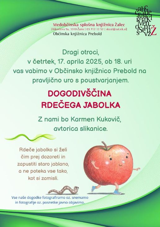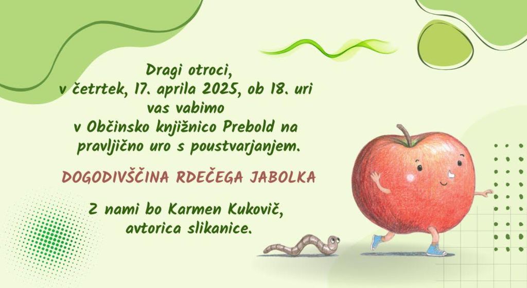 rdeče jabolko se odpravlja na posebno pomladno dogodivščino, bodite z nami tudi vi v četrtek, 17. aprila 2025, ob 18. uri v Občinski knjižnici Prebold.