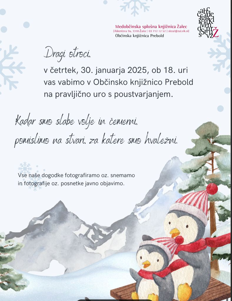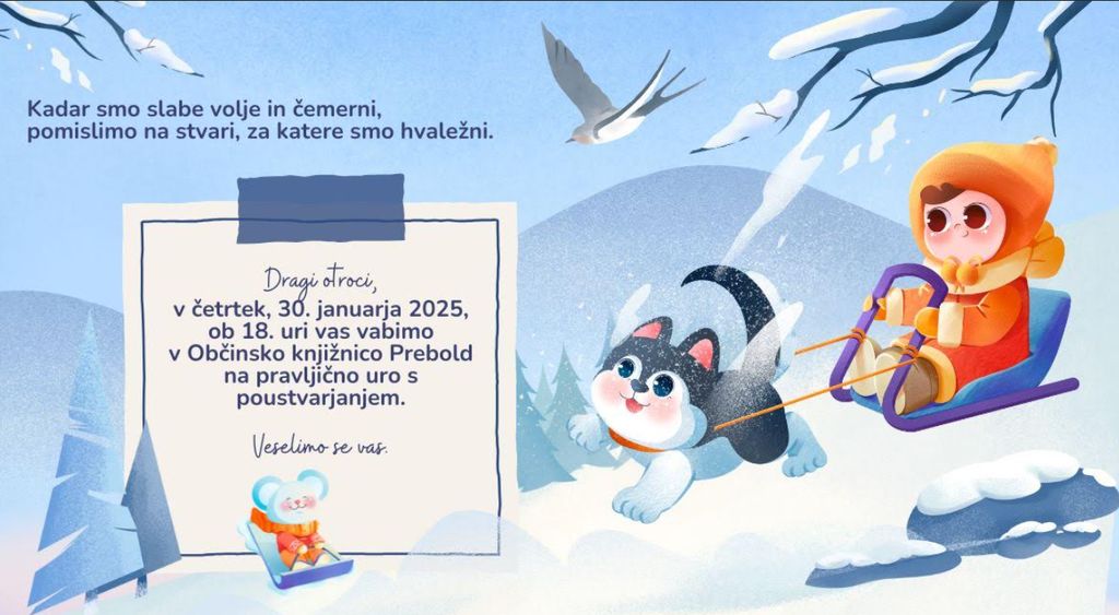 pravljična ura s poustvarjanjem bo v Občinski knjižnici Prebold v četrtek, 30. januarja 2025, ob 18. uri. Vabljeni s svojimi najmlajšimi, veselimo se vas.