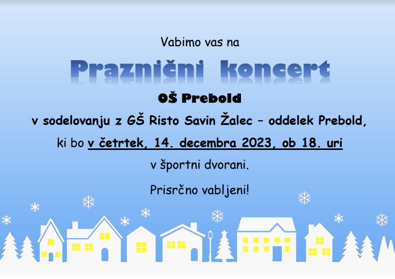 OŠ Prebold vabi na praznični koncert v sodelovanju z Glasbeno šolo Risto Savin Žalec, ki bo v četrtek 14. 12. 2023 ob 18.00 uri v športni dvorani.