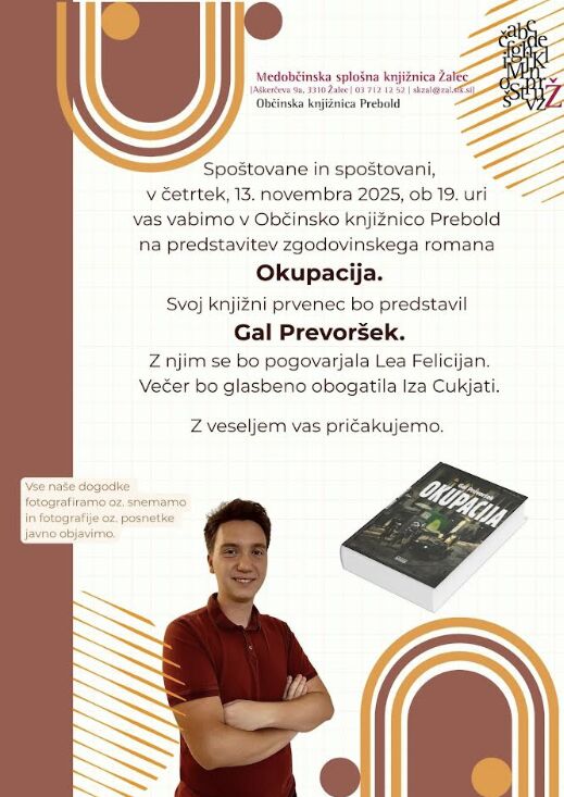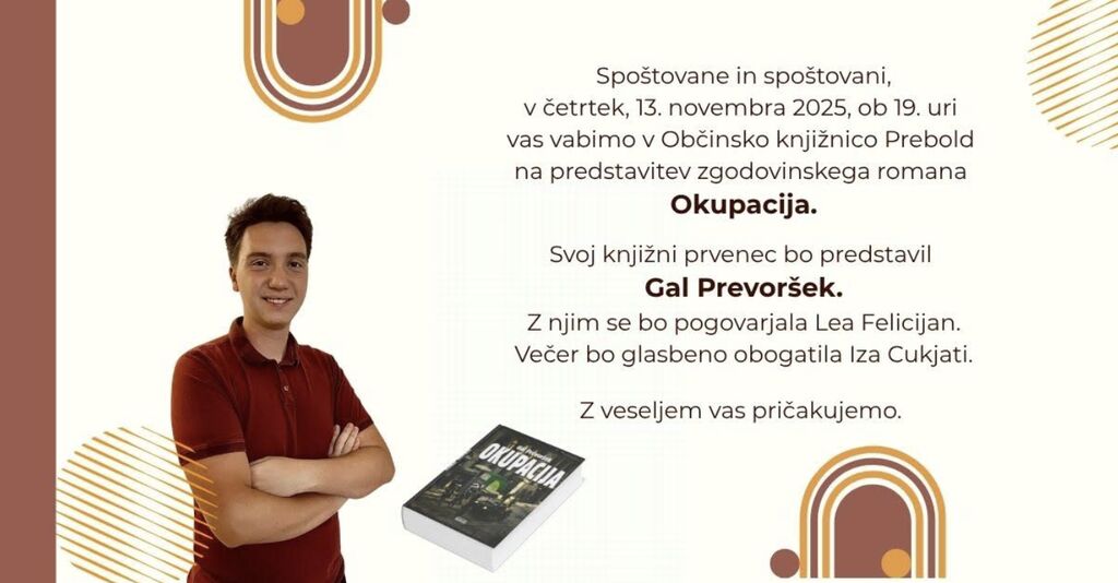 v Občinski knjižnici Prebold bo v četrtek, 13. novembra 2025, ob 19. uri svoj knjižni prvenec predstavil Gal Prevoršek.