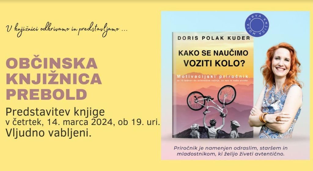 V Občinski knjižnici Prebold bomo odkrivali, kako v življenju avtentično voziti kolo in kako pri tem uporabiti vse prestave. Svoj prvi motivacijski priročnik bo predstavila Doris Polak Kuder.