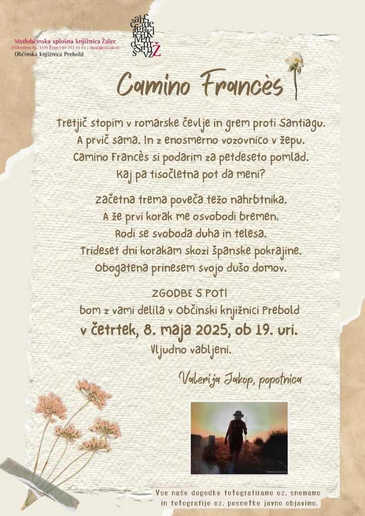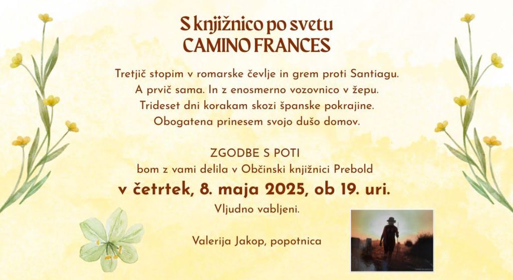 v četrtek, 8. maja 2025, ob 19. uri vas vabimo s knjižnico po svetu. Svoje zgodbe s poti Camino Frances bo z nami delila popotnica Valerija Jakop. Občinska knjižnica Prebold vas z veseljem pričakuje.