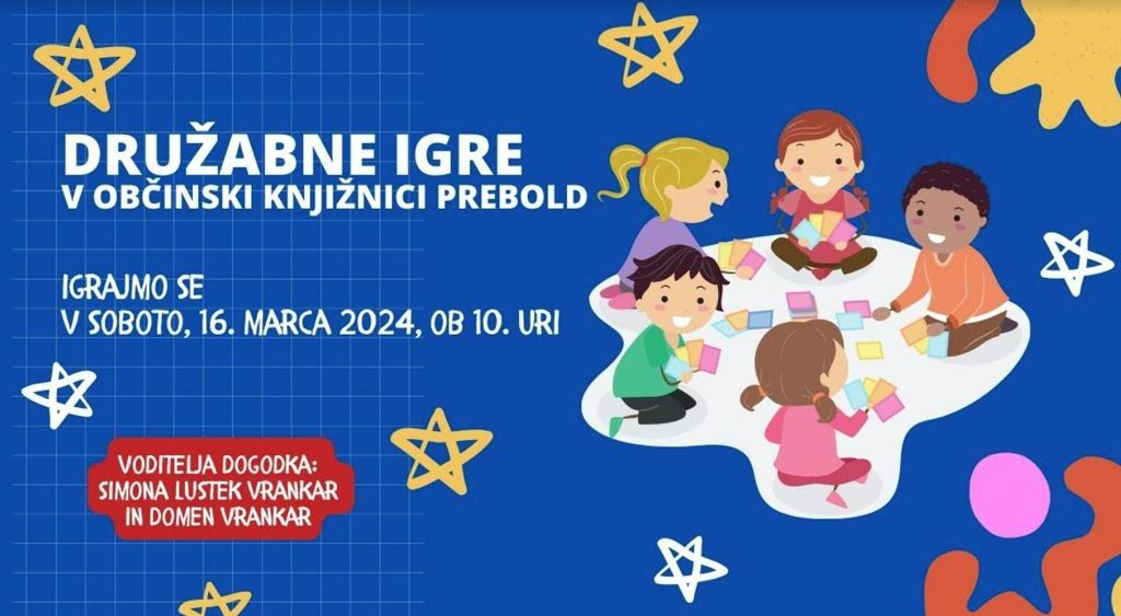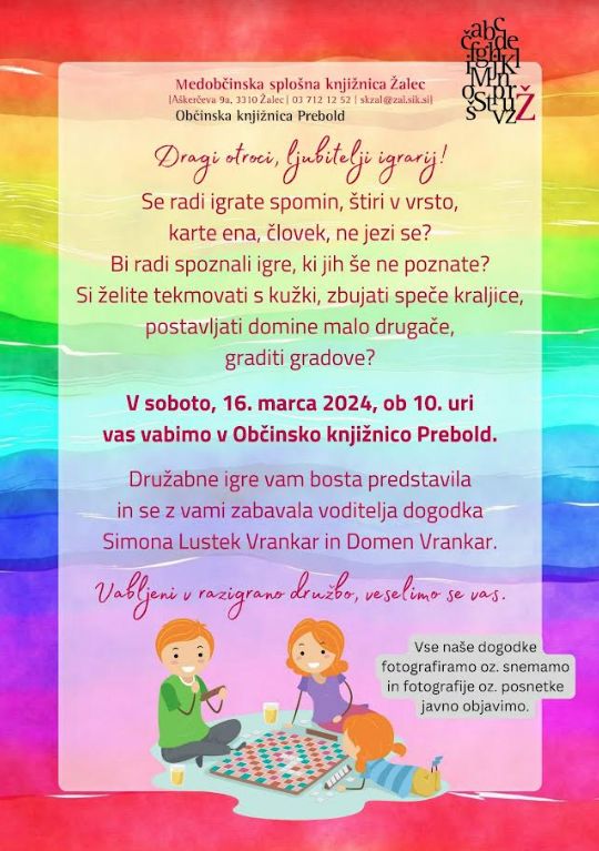 Vabljeni v Občinsko knjižnico Prebold na sobotno igralnico. Simona Lustek Vrankar in Domen Vrankar imata za vas pripravljene številne družabne igre. Igrajmo se skupaj.