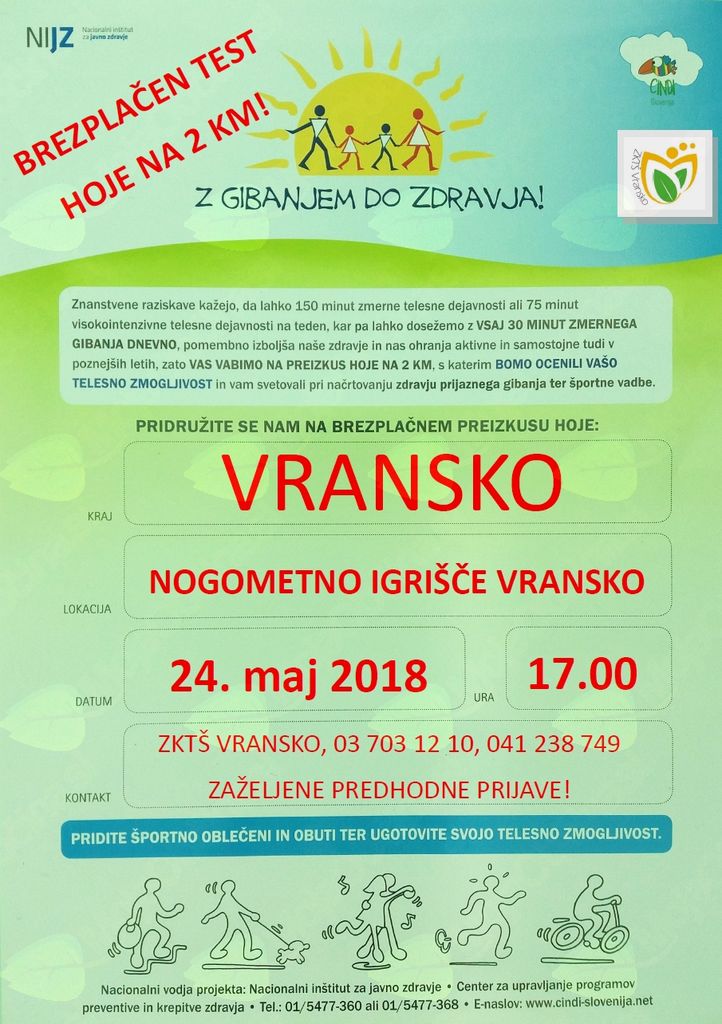 Pridružite se nam na brezplačnem preizkusu hoje na 2km. Hoja in meritve bodo potekale na NOGOMETNEM IGRIŠČU NA VRANSKEM. Meritve bodo izvajali stokovnjaki s programa CINDI.