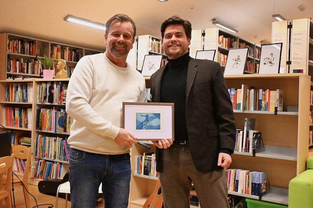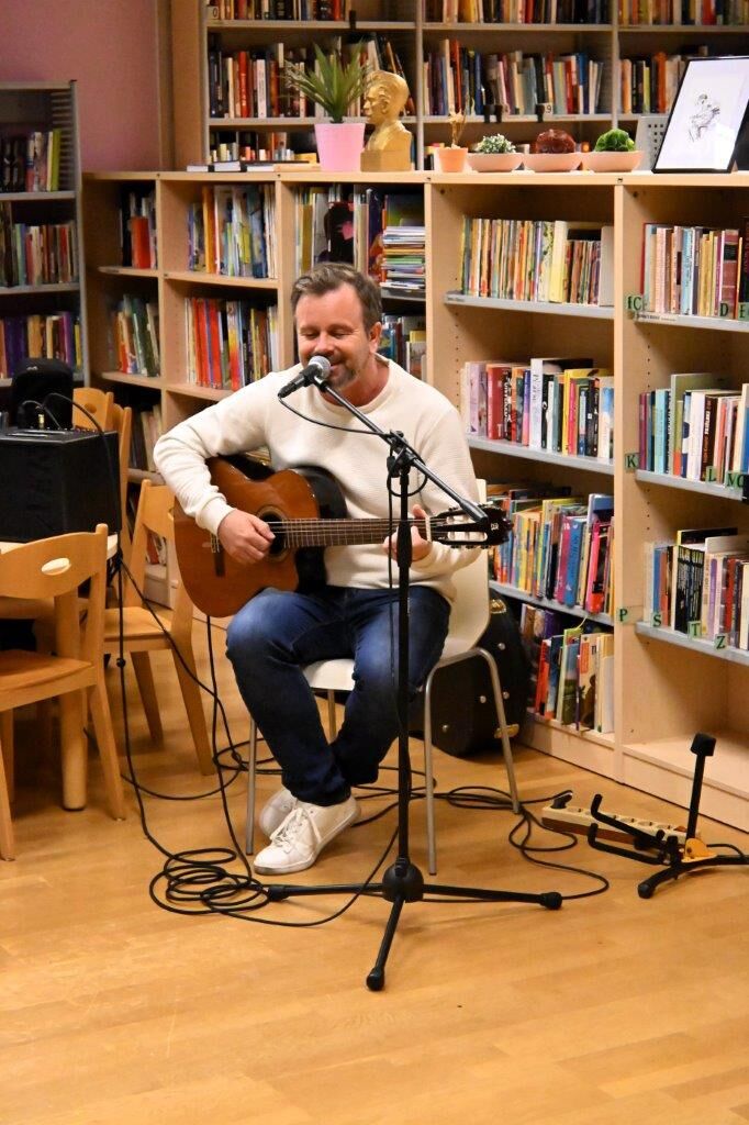 Pogovor z ustvarjalcem je vodila knjižničarka, mag. Lea Felicijan. Spoznali smo Timovo pripoved o poti ustvarjanja in navdiha, njegov pogled na ustvarjalne procese in umetniški razvoj. Beseda je tekla o njegovih začetkih v otroštvu, prvih stikih z risanjem, slikanjem in glasbo ter o odločitvah, ki so zaznamovale njegovo izobraževalno pot, vse od umetniške gimnazije v Celju do študija glasbe in pedagogike v Celovcu. Posebna pozornost je bila namenjena vplivu mentorjev, mednarodnim izkušnjam ter študiju klasične kitare, lutnje in stare glasbe. Vseskozi je združeval koncertno in pedagoško delo, intenzivno se je usmeril v likovno umetnost ter se posvetil študiju slikarstva in grafike v Gradcu, ki ga uspešno končuje. Zbranost, osredotočenost in notranje ravnovesje najde v sproščujočih dejavnostih, kot so qi gong, lokostrelstvo in kuhanje.