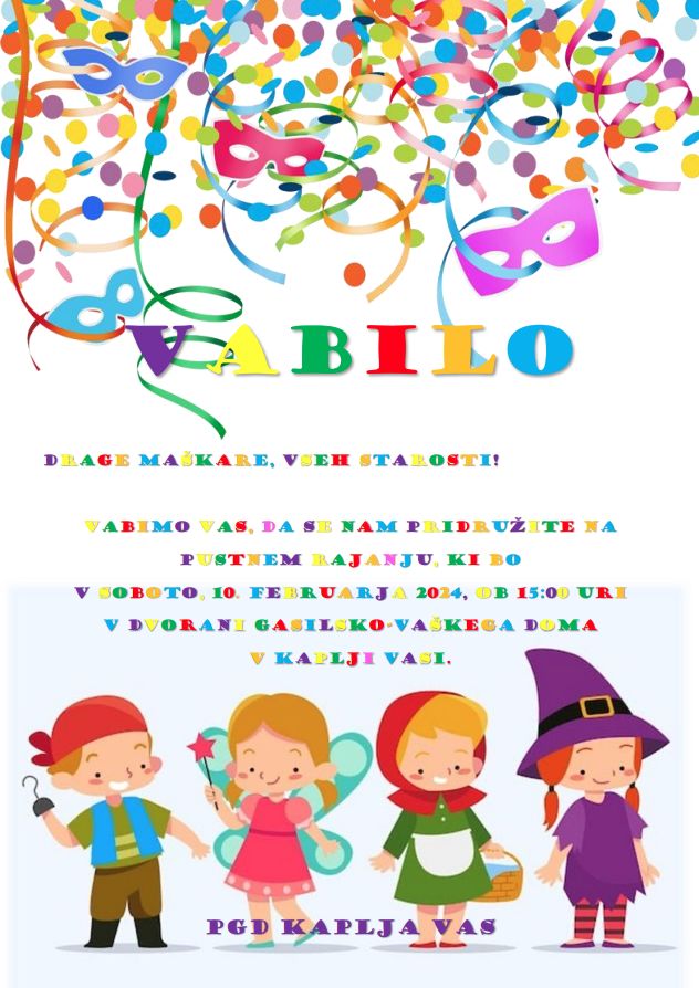 PGD Kaplja vas vabi vse maškare, da se jim pridružite na pustnem rajanju, ki bo v soboto, 10. februarja 2024 ob 15.00 uri v Dvorani gasilsko-vaškega doma v Kaplji vasi.