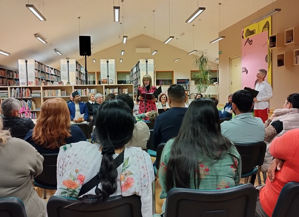 Dragica iz Bosne je prebrala lirično pesem o ljubezni in naravi, podobno razpoloženje pa je vzbudila tudi Prešernova tretja Gazela, ki jo je predstavil Andrej. Anzhela iz Ukrajine in Tideja sta izbrali pesmi o življenju, njegovi krhkosti in dragocenosti. Donijeta je v albanščini prebrala ljubezensko pesem o luči srca, Urška jo je predstavila v slovenščini. Ljubezenske teme so zazvenele v narečju: Agica, ki prihaja iz Prekmurja, je prebrala Lainščkovo pesem Nikad ne boš znala. Lidija se je odzvala s Kosovelovimi verzi Pa da bi znal. Program je poslušalce za trenutek popeljal v otroštvo, ko je Božena v švedščini prebrala pesem o Piki Nogavički. Pravljico o čarovniškem mucu je nato prebral Andrej. Elke je brala v nemščini ter poslušalce popeljala v svet znanstvene fantastike in vesolja. Z Matejo smo šli na medzvezdno potovanje. Mike iz Anglije je bral o svoji domovini, Tanja o ljubezni do svoje dežele Slovenije, posebno zanimanje pa je vzbudila nepalska pravljica o dedku in košari, o odnosu do starosti ter spoštovanju in razumevanju starejših, ki jo je z nami delil Birman.