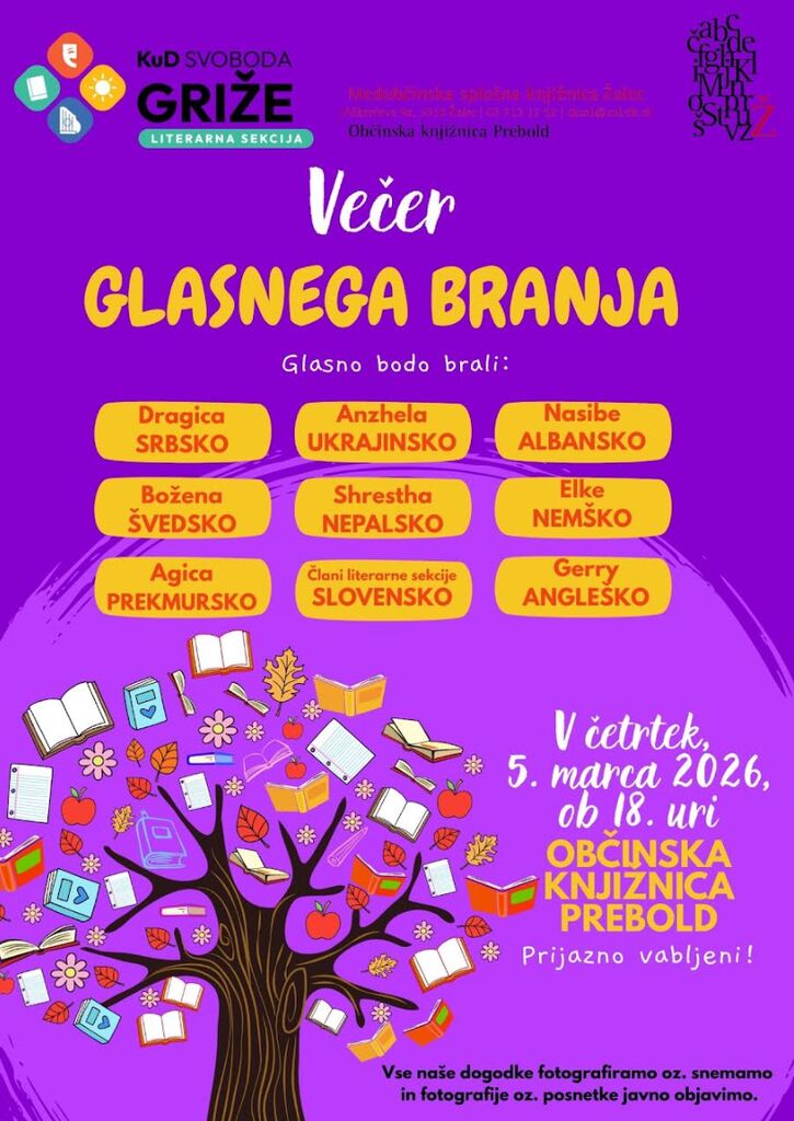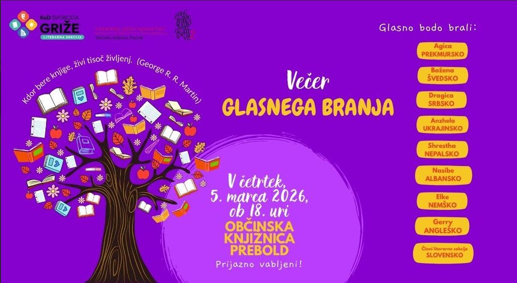 v sodelovanju s priseljenci in KuD Svoboda Griže pripravljamo večer glasnega branja v različnih jezikih. Kulturno in jezikovno bogastvo doživite v četrtek, 5. marca 2026, ob 18. uri v Občinski knjižnici Prebold.