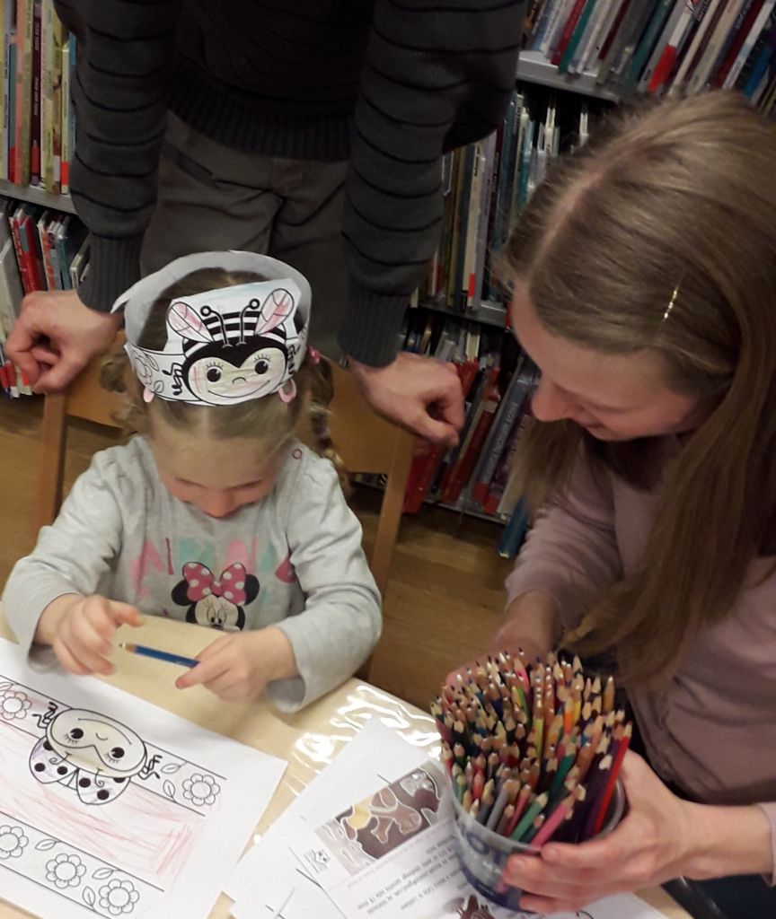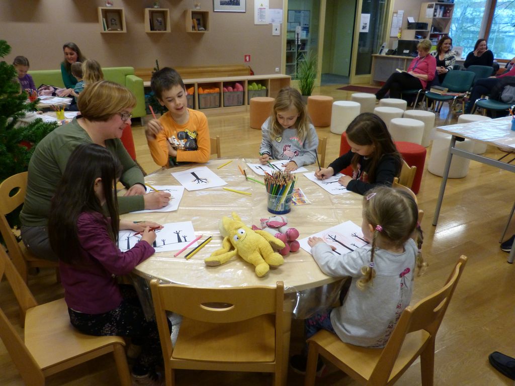 V ustvarjalnem delu pravljične ure so si otroški prstki izdelali papirnate gozdne živali v obliki kronic ali zapestnic, domišljija pa jih je popeljala tudi v poustvarjanje drevesnih krošenj, pod katerimi se skrivajo siničke, veveričke, lisičke in tudi kakšen pogumni medved.