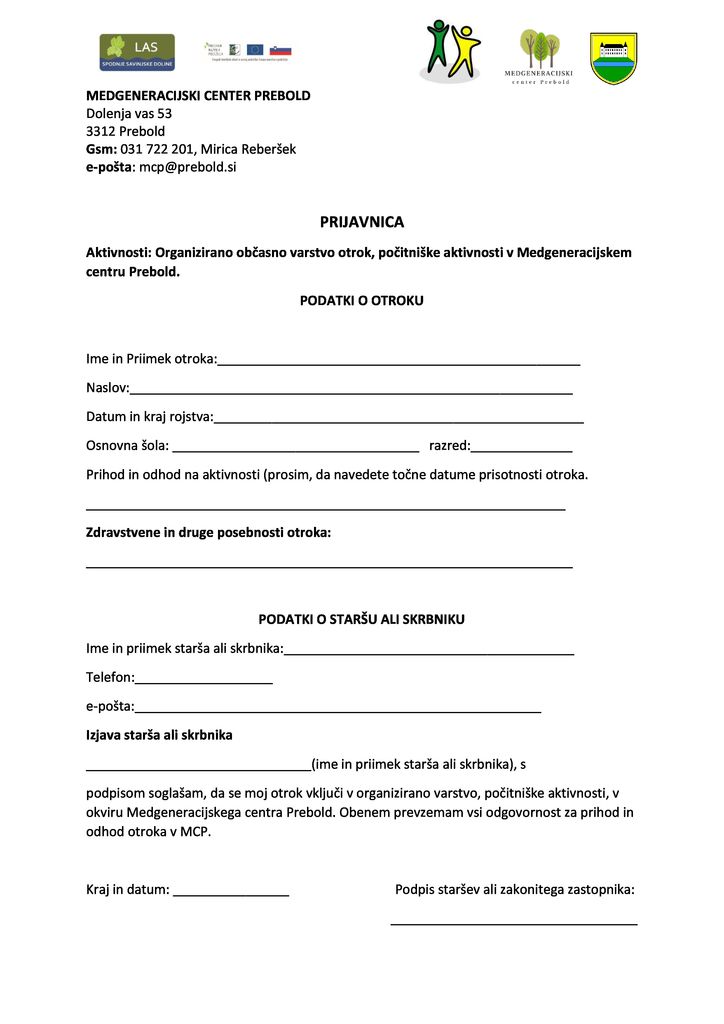 V prilogi najdete prijavnico in soglasje, ki ju prosimo izpolnite in jih pošljite po e pošti, ali prinesite v center.