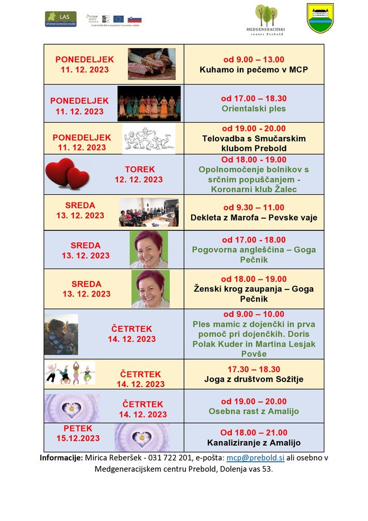 Tedenski program Medgeneracijskega centra Prebold, od ponedeljka, 11. 12. 2023 do 15.12.2023