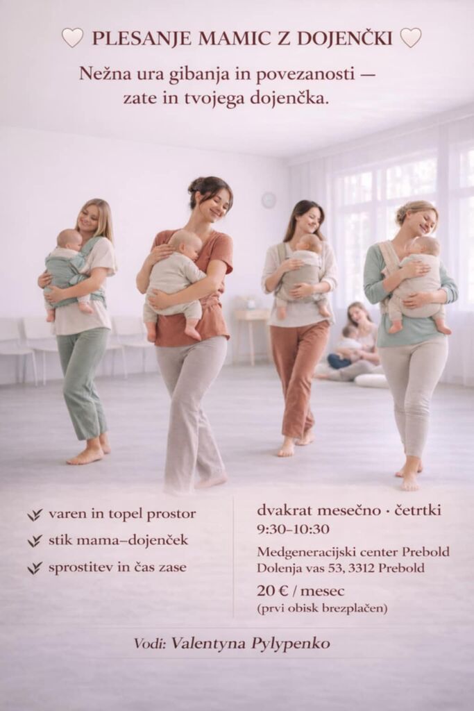 Na plesanju mamic z dojenčki se gibamo nežno, v taktu glasbe, z dojenčkom v naročju ali v nosilki.