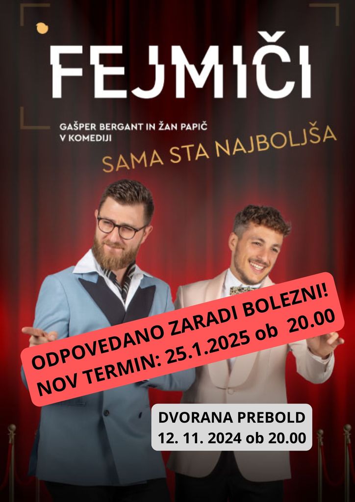 Predstava Fejmiča, ki bi morala biti v torek, 12.11. v Dvorani Prebold ODPOVEDANA zaradi bolezni v zasedbi.