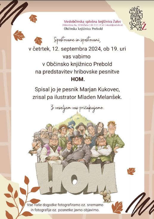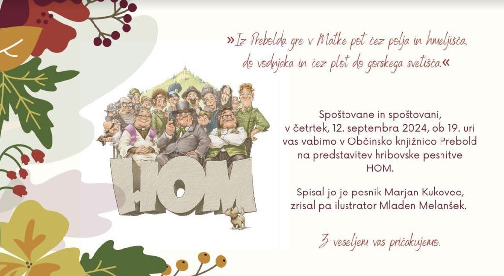 v Občinsko knjižnico Prebold vas v četrtek, 12. septembra 2024, ob 19. uri vabimo na predstavitev hribovske pesnitve Hom. Spisal jo je pesnik Marjan Kukovec, zrisal pa ilustrator Mladen Melanšek. Z veseljem vas pričakujemo.