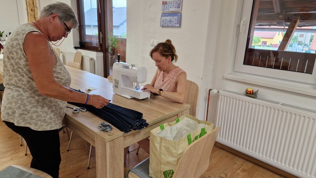 Lani smo šivali cele cekrčke, letos pa se je ena mamica, ki je vešča tega dela, ponudila, da zašije cekrčke. Mi pa ročaje. Vabilu sta se odzvali prostovoljki Jožica in Anita.