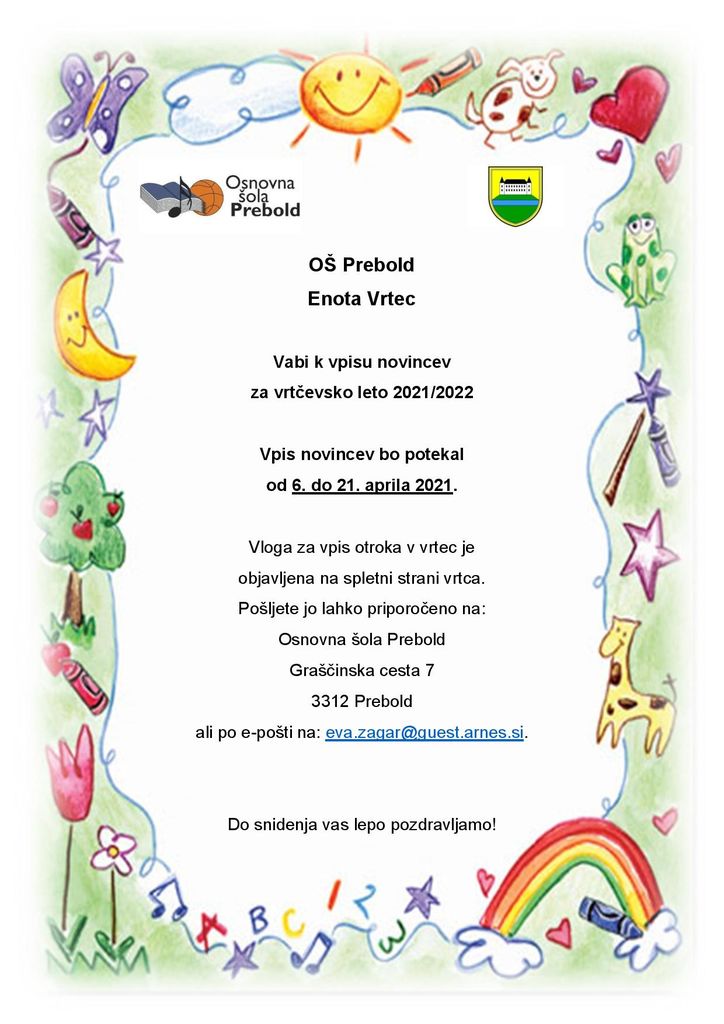 Vpis otrok v Vrtec Prebold od 6. do 21. aprila 2021