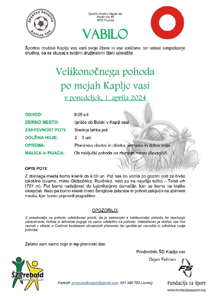 Športno društvo Kaplja vas vabi na Velikonočni pohod po mejah Kaplje vasi.