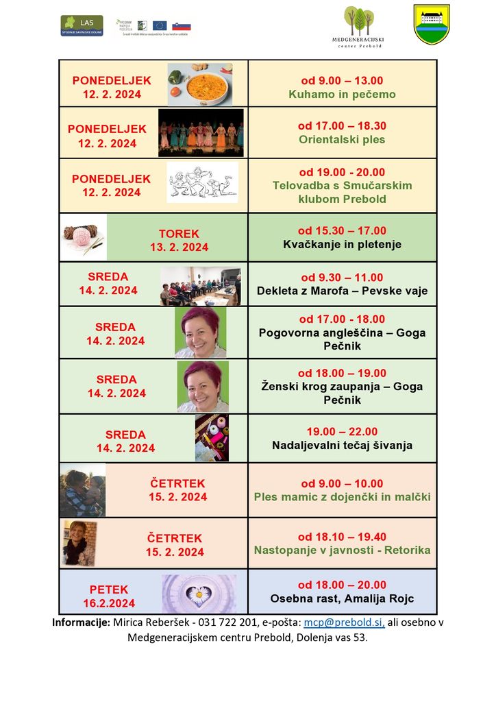 Tedenski program Medgeneracijskega centra Prebold, od ponedeljka, 12. 2. 2024 do petka, 16.2.2024