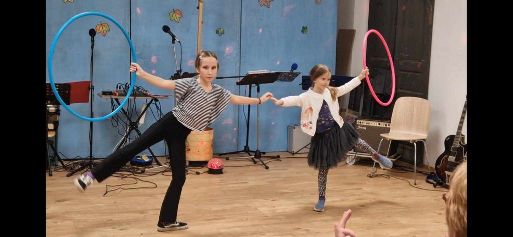 Program se je nadaljeval z izjemno glasbeno-plesno točko talentiranih sestric Ajde in Ane, ki sta nas navdušili z virtuozno igro na inštrumentih, nato pa še s skupnim plesom z obroči. Njuna energija in kreativnost sta občinstvo povsem prevzeli.
