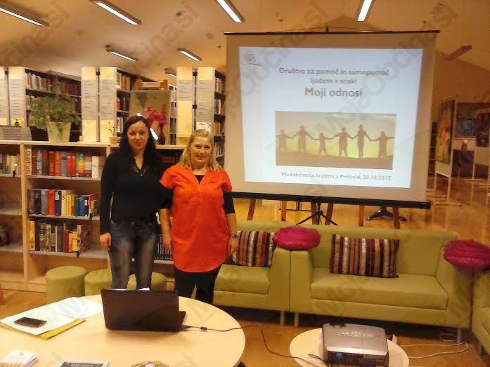 V torek, 20. oktobra 2015, se je v Občinski knjižnici Prebold predstavilo Društvo za pomoč in samopomoč ljudem v stiski Moji odnosi, in sicer v sklopu Utripa domoznanstva, ki tematsko poteka pod okriljem domoznanskega oddelka Medobčinske splošne knjižnice Žalec. Zbranim sta mnogo koristnih informacij o tem, kako pristopiti in tako narediti majhen korak do boljše življenjske poti, podali predsednica društva Urša Zabukovnik in njena sodelavka Nevenka Rabuza. Prireditve se je udeležil tudi župan Občine Prebold Vinko Debelak.