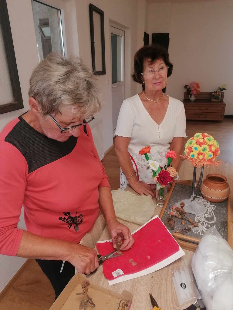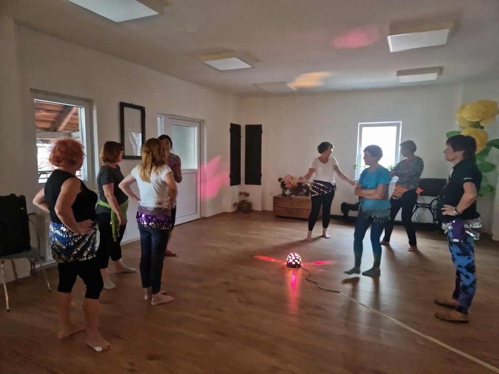 Izdelava rožic iz krep papirja in šivanje cekrčka, oboje za predstavitev. Še nekaj rožic smo dobili od gospe Tončke. Popoldan pa kot vsak ponedeljek še orientalski ples.