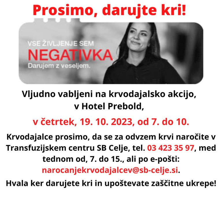 Krvodajalska akcija, v Hotelu Prebold, v četrtek, 19. 10. 2023, od 7. do 10. ure!