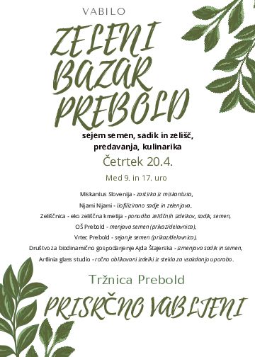 Vabljeni danes, četrtek 20.4. do 17.00 na prostore Kmečke tržnice Prebold, kjer poteka Zeleni bazar.