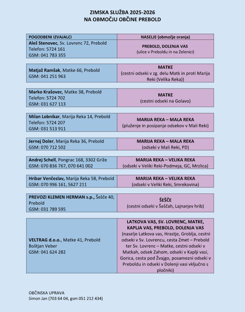 Zimska služba 2025/2026 na območju Občine Prebold