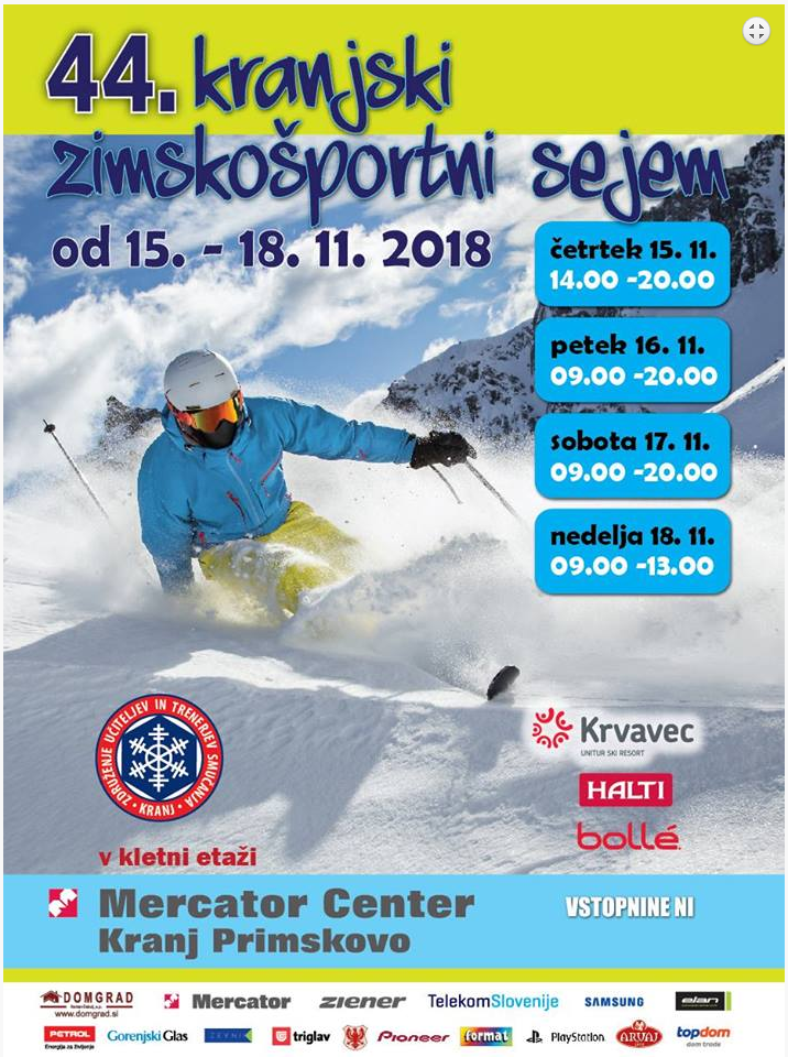 Ker je marsikateri otrok že prerasel lanskoletno smučarsko opremo, prilagamo obvestilo, da bo v drugi polovici tega tedna od četrtka do nedelje 15. - 18.11.2018 v kletni etaži Mercator Centra Kranj Primskovo potekal že 44. kranjski zimskošportni sejem, kjer lahko poskrbite za ustrezno zamenjavo opreme. Na sejmu bomo delali in vam lahko svetovali tudi učitelji smučanja z našega smučarskega tečaja. VABLJENI!
