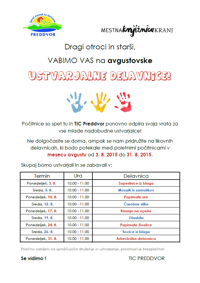 Tudi v avgustu bo v TIC-u Preddvor pestro!