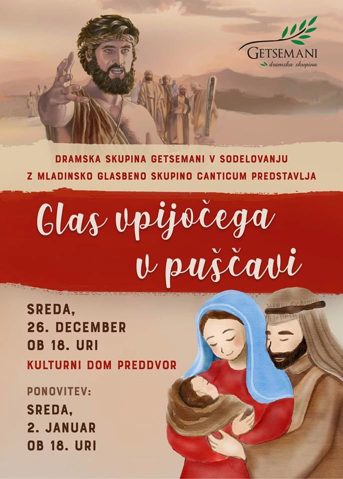 Dramska skupina Getsemani v sodelovanju z Mladinsko glasbeno skupino Canticum vabi na božično igro z naslovom Glas vpijočega v puščavi. Predstava bo v sredo, 26.12.2018 ob 18h v Kulturnem domu v Preddvoru. Prostovoljni prispevki bodo namenjeni delovanju Dramske skupine Getsemani.