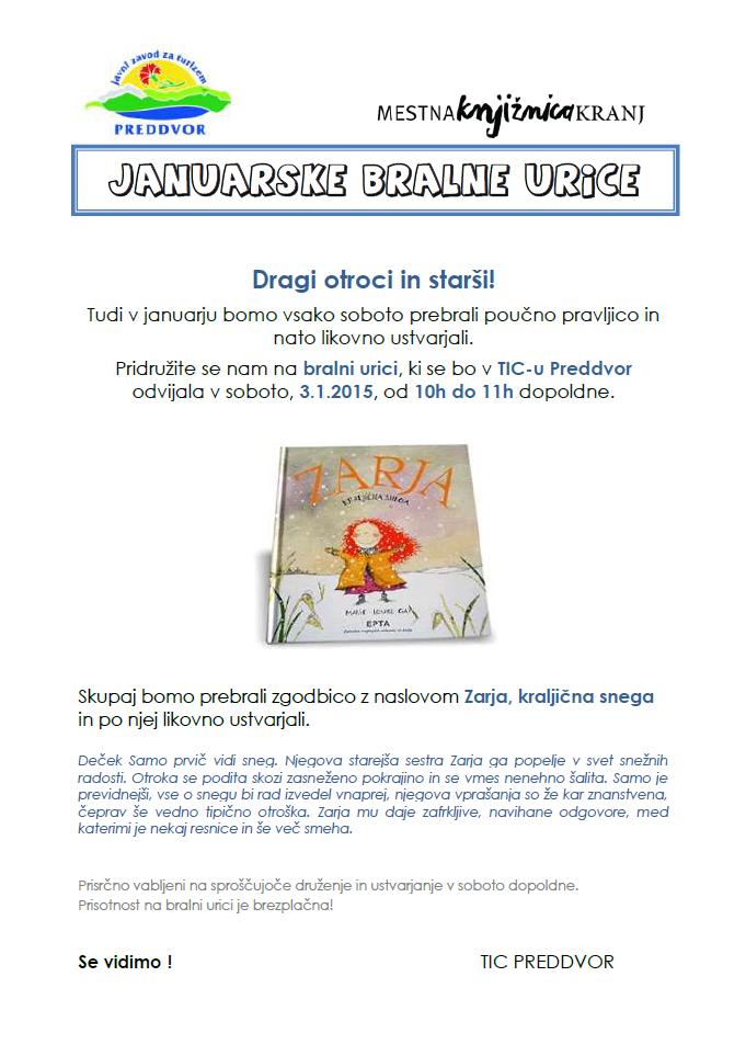 V soboto, 3. 1. 2015, bomo ob 10 uri prebrali zgodbico z naslovom 'Zarja, kraljična snega'.