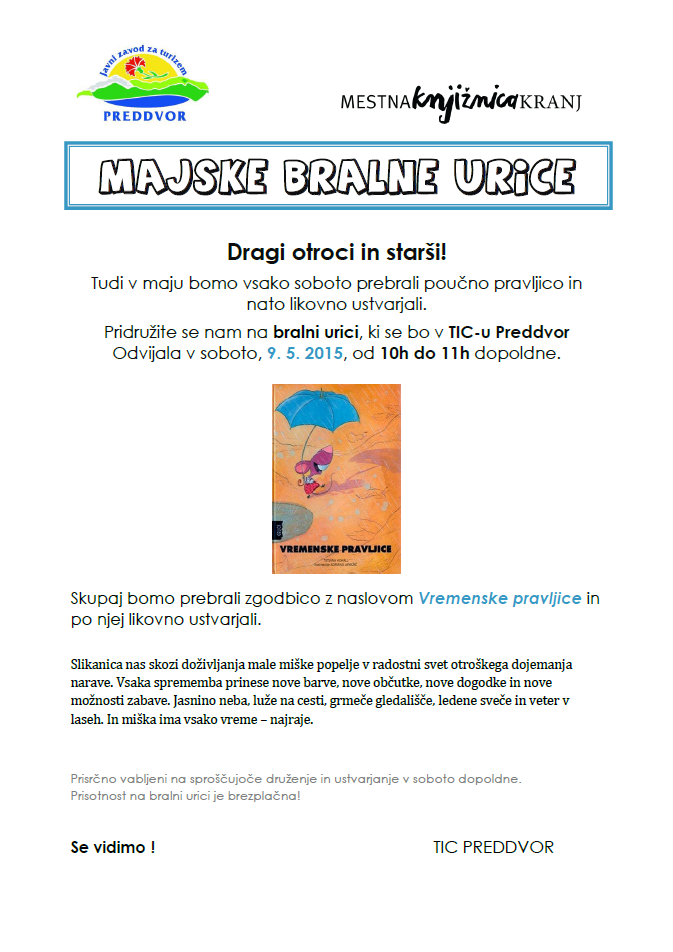 Pridružite se nam na bralni urici, ki se bo v TIC-u Preddvor odvijala v soboto, 9. maja, od 10h do 11h dopoldne.
