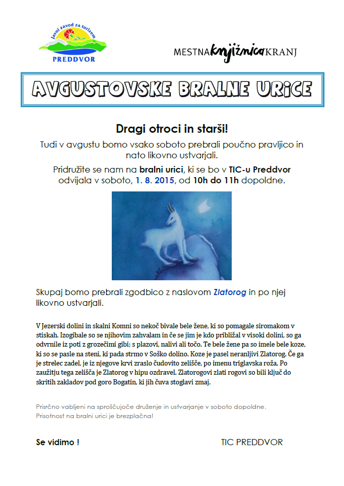 Pridružite se nam na bralni urici, ki se bo v TIC-u Preddvor odvijala v soboto, 1. 8. 2015, od 10h do 11h dopoldne.