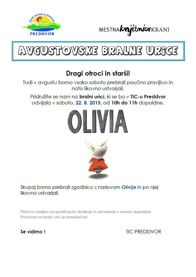 Pridružite se nam na bralni urici, ki se bo v TIC-u Preddvor odvijala v soboto, 22. 8. 2015, od 10h do 11h dopoldne.