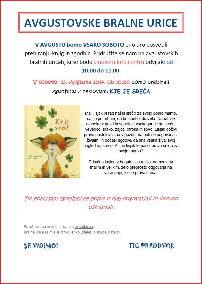 V soboto, 23.8.2014, ob 10. uri bomo prebrali knjigo z naslovom Kje je sreča?.