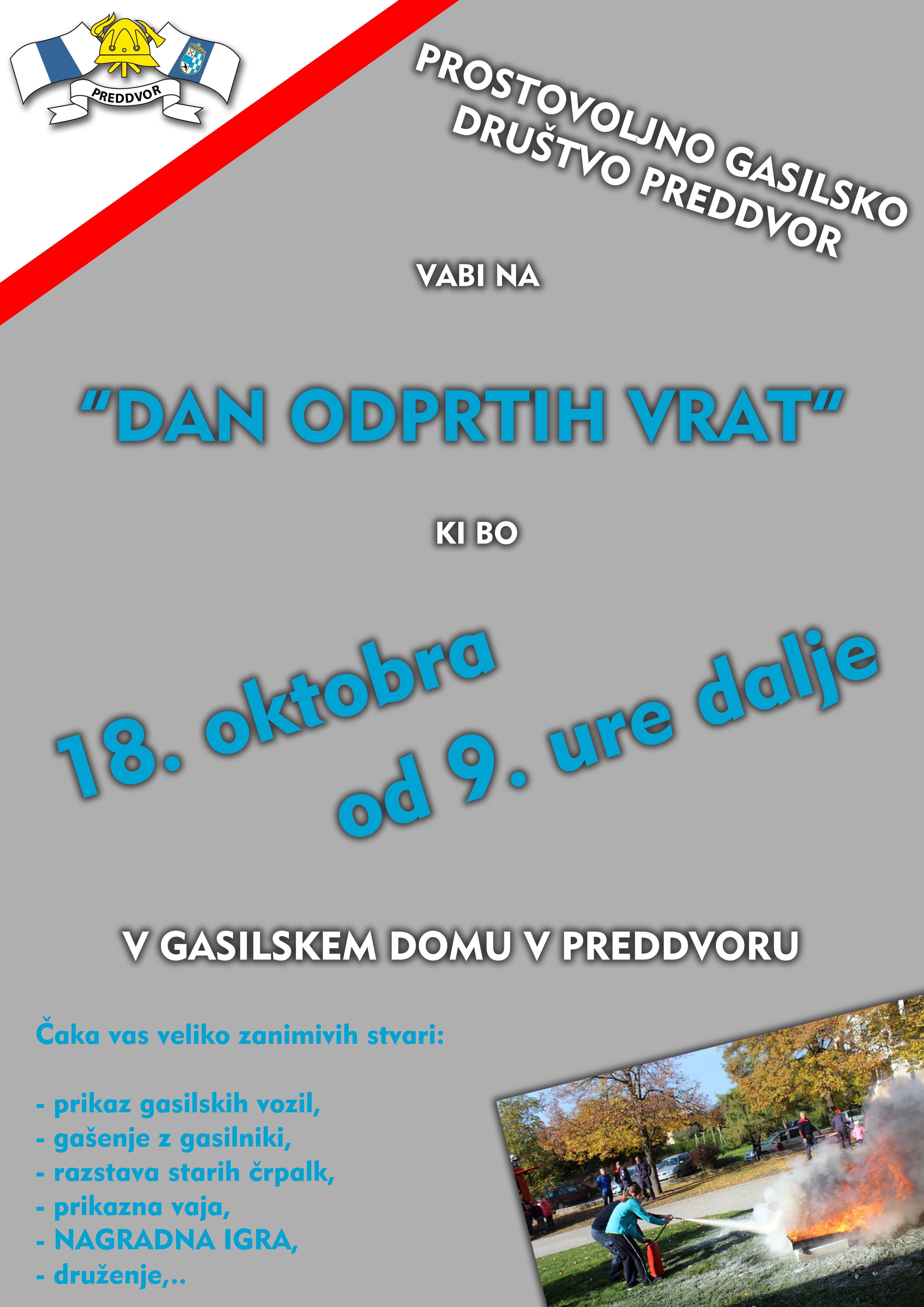 PGD PREDDVOR že drugo leto zapored v mesecu oktobru organizira DAN ODPRTIH VRAT. Oktober je mesec požarne varnosti zato želimo vsem občanom približati rokovanje z gasilnikom, delo gasilcev in naše društvo. Dogodkov, ki se bodo odvijali čez dan bo veliko, tako bodo tako odrasli kot otroci na ta dan lahko našli kaj zanimivega zase. Dopoldne vam bomo na kratko predstavili naša vozila, gasilnike, stare gasilske črpalke, manjkalo ne bo niti domačih sladkih dobrot. Potekale bodo tudi otroške ustvarjalne delavnice in zabavne gasilske igre za otroke. V popoldanskem času se bodo operativni gasilci predstavili s prikazno vajo , »posladkali« pa se boste lahko tudi s pečenim kostanjem.