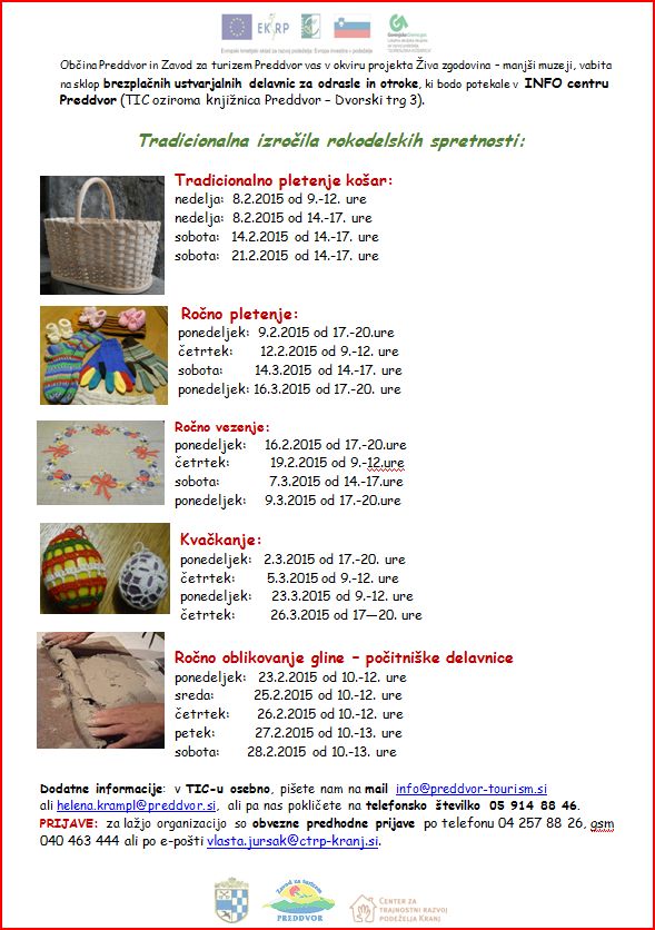 Občina Preddvor in Zavod za turizem Preddvor vas v okviru projekta Živa zgodovina – manjši muzeji, vabita na sklop brezplačnih ustvarjalnih delavnic za odrasle in otroke, ki bodo potekale v INFO centru Preddvor (TIC oziroma knjižnica Preddvor – Dvorski trg 3).