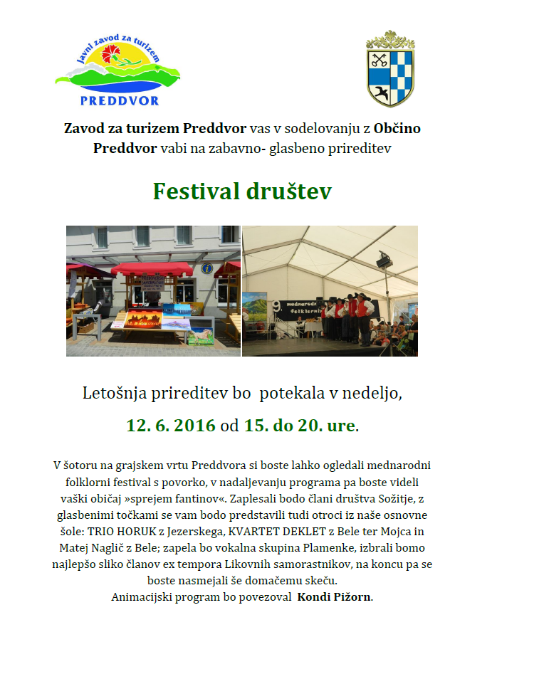 Zavod za turizem Preddvor vas v sodelovanju z Občino Preddvor vabi na zabavno- glasbeno prireditev Festival društev. Letošnja prireditev bo potekala v nedeljo,12. 6. 2016, od 15. do 20. ure.