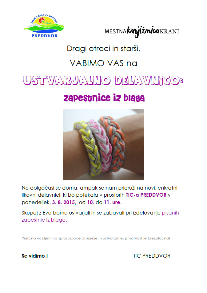 Začenjajo se avgustovske ustvarjalne delavnice! Prva na sporedu bo v ponedeljek 3. 8. 2015, ko bomo izdelovali lepe zapestnice iz blaga. Lepo vabljeni v TIC na poletno dozo ustvarjanja!