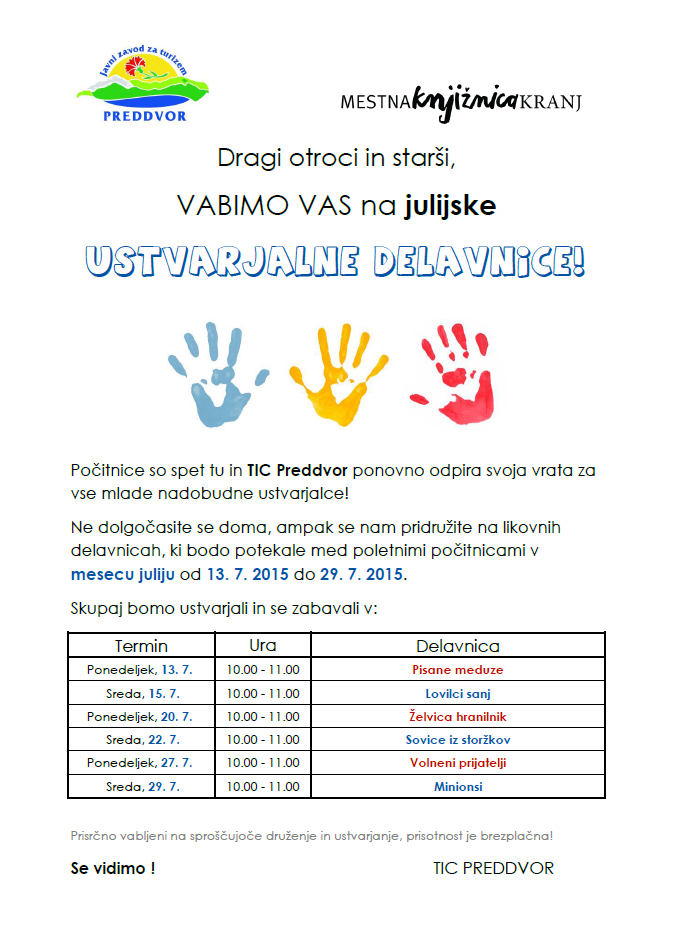 Vabljeni na poletne ustvarjalne delavnice v TIC Preddvor, vsak ponedeljek in sredo od 10.00-11.00. Pridružite se nam in preživite kreativne počitnice na zabaven način.