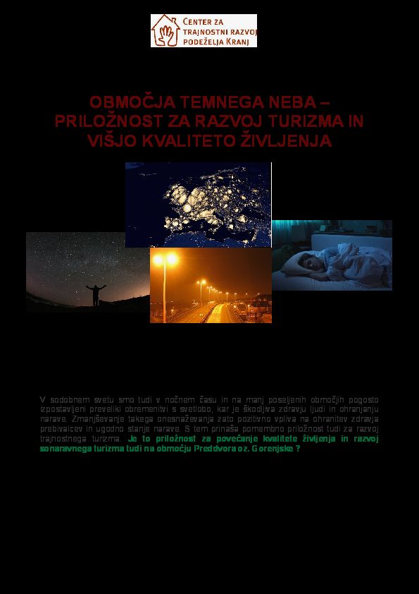 Center za trajnostni razvoj podeželja Kranj v okviru programa Podeželsko razvojno jedro vabi na okoljsko-razvojno delavnico OBMOČJA TEMNEGA NEBA – PRILOŽNOST ZA RAZVOJ TURIZMA IN VIŠJO KVALITETO ŽIVLJENJA. Delavnica bo v četrtek 20. decembra 2018 ob 18.uri v TICu Preddvor (Dvorski trg 3, 4205 Preddvor).