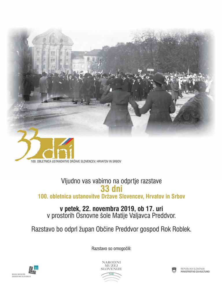 V prostorih Osnovne šole Matije Valjavca Preddvor bo v petek, 22. novembra 2019, ob 17. uri odprtje razstave 33 dni - 100. obletnica ustanovitve Države Slovencev, Hrvatov in Srbov, ki so jo pripravili v Narodnem muzeju Slovenije v sodelovanju z Muzejem novejše zgodovine Slovenije in Ministrstvom za kulturo. Razstavo bo odprl župan Občine Preddvor Rok Roblek, ogledati pa si jo bo moč do 15. januarja 2020. Vabljeni!