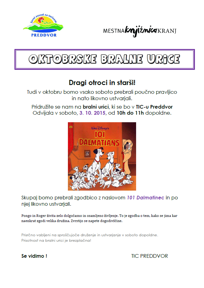 Dragi otroci in starši, tudi oktobra bodo v TIC Preddvor vsako soboto od 10.00 do 11.00 potekale bralne urice. Prva med pravljicami bo 101 dalmatinec. Lepo vabljeni!