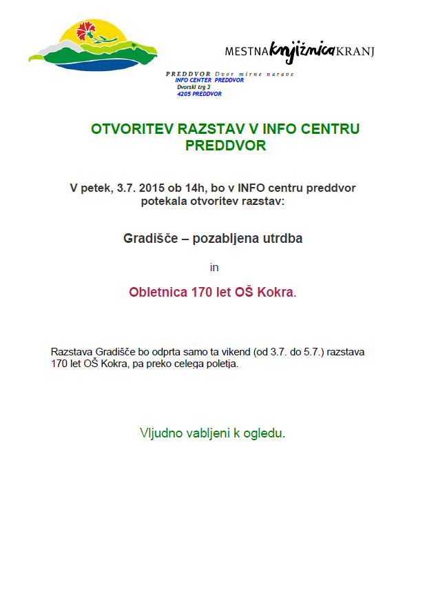 Razstava Gradišče bo odprta samo ta vikend (od 3.7. do 5.7.) razstava 170 let OŠ Kokra, pa preko celega poletja.