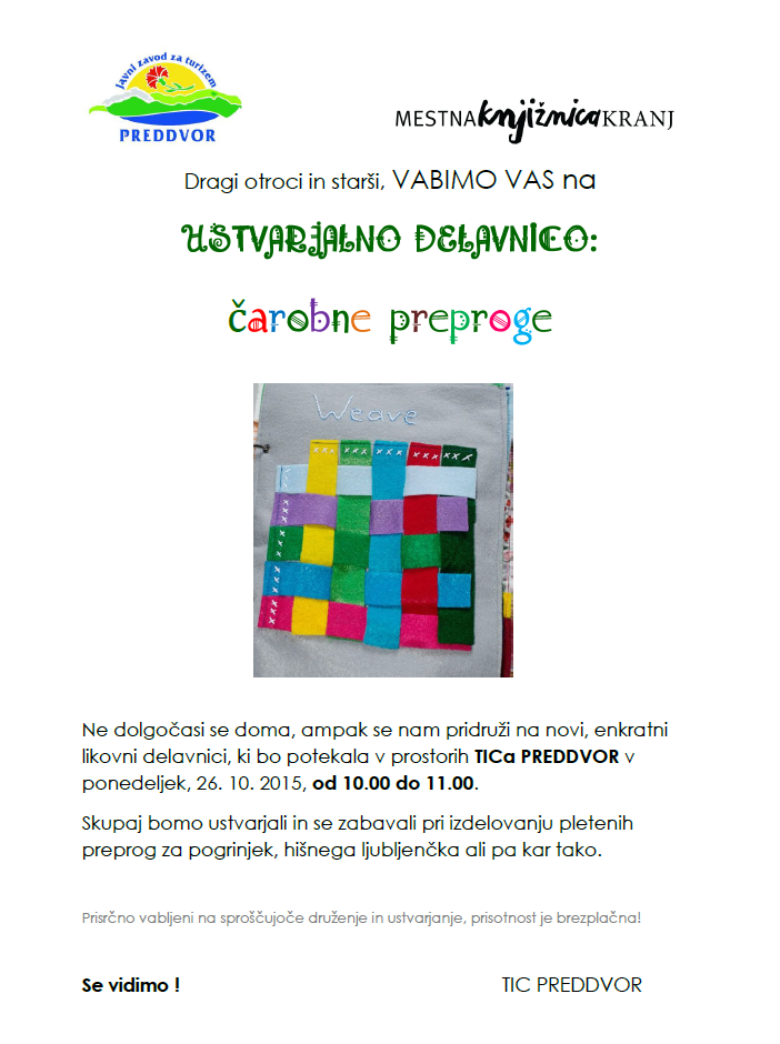 V ponedeljek, 26. 10. 2015 se nam pridružite v prostorih TICa, kjer bomo izdelovali čarobne preproge. Udeležba delavnice je brezplačna, prinesite le dobro voljo in ščep kreativnosti. Se vidimo!