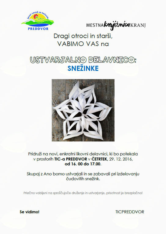 v prostorih TIC-a PREDDVOR v ČETRTEK, 29. 12. 2016, od 16. 00 do 17.00.